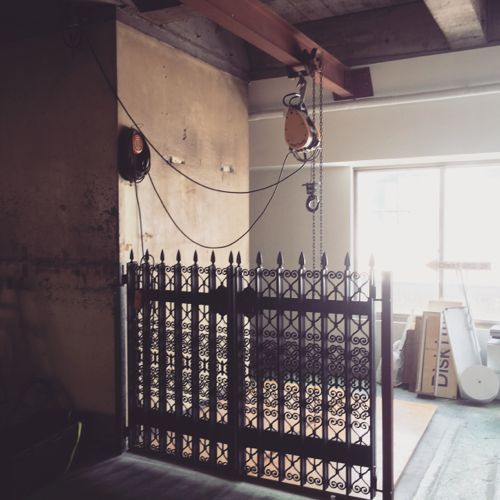 もういっちょ、3Fの様子。どっかの現場で使われていた本来ならゴミになるはずだった柵?門扉?よくわからないですが、唐突に現れるこの感じすごく好きです。数年前に中国のリノベ物件をいくつか見てまわって、中にはアーティストさん達が古いビルを自分達のDIYでアトリエにしているところもあり、なんというかルールが無くはちゃめちゃなようで、けど、カッコいい。それをちょっと思い出しました。